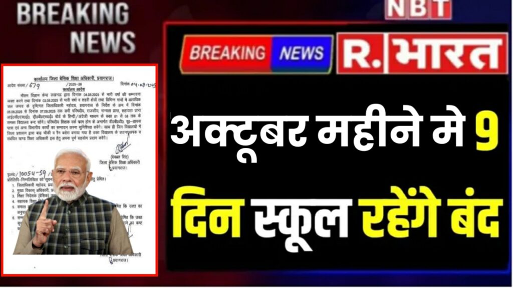 School College Holiday News : आज से सभी स्कूल-कॉलेज 9 दिन लगातार बंद रहेंगे, नया आदेश हुआ जारी आप सभी को विद्यार्थी स्कूल मैं पढ़ाई जाते हैं उन सभी के लिए बहुत ही खुशी के बात है कि स्कूल कॉलेजों को 9 दिनों के लिए स्कूल खुले बच्चों को बंद किया गया अक्टूबर माह में … Continue reading School College Holidays News : आज से सभी स्कूल-कॉलेज 9 दिन लगातार बंद रहेंगे, नया आदेश हुआ जारी